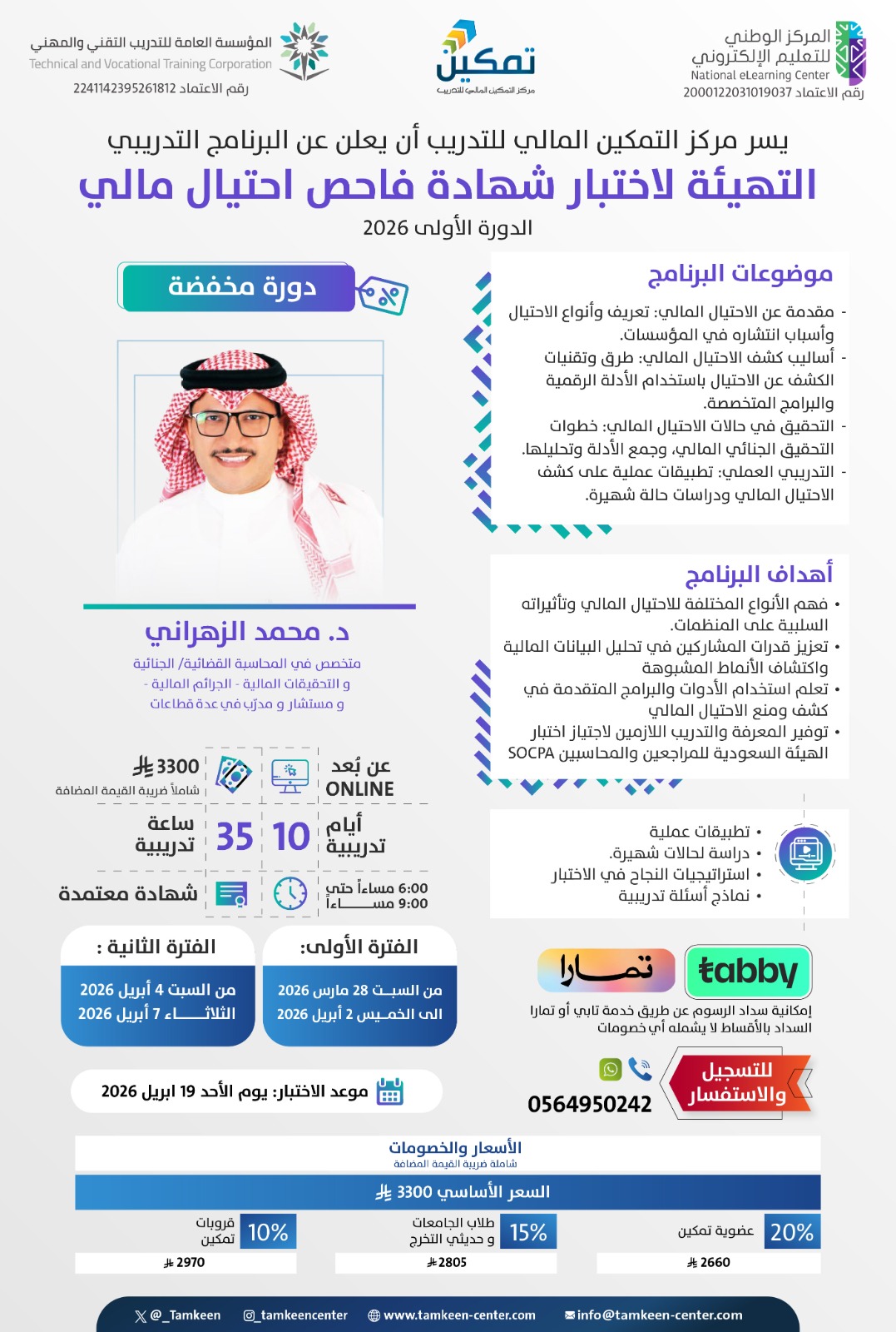 رجاءً تسجيل الدخول لمشاركة هذا التهيئة لاختبار فاحص احتيال مالي - الدورة (1) 2026 عن طريق البريد الإلكتروني.