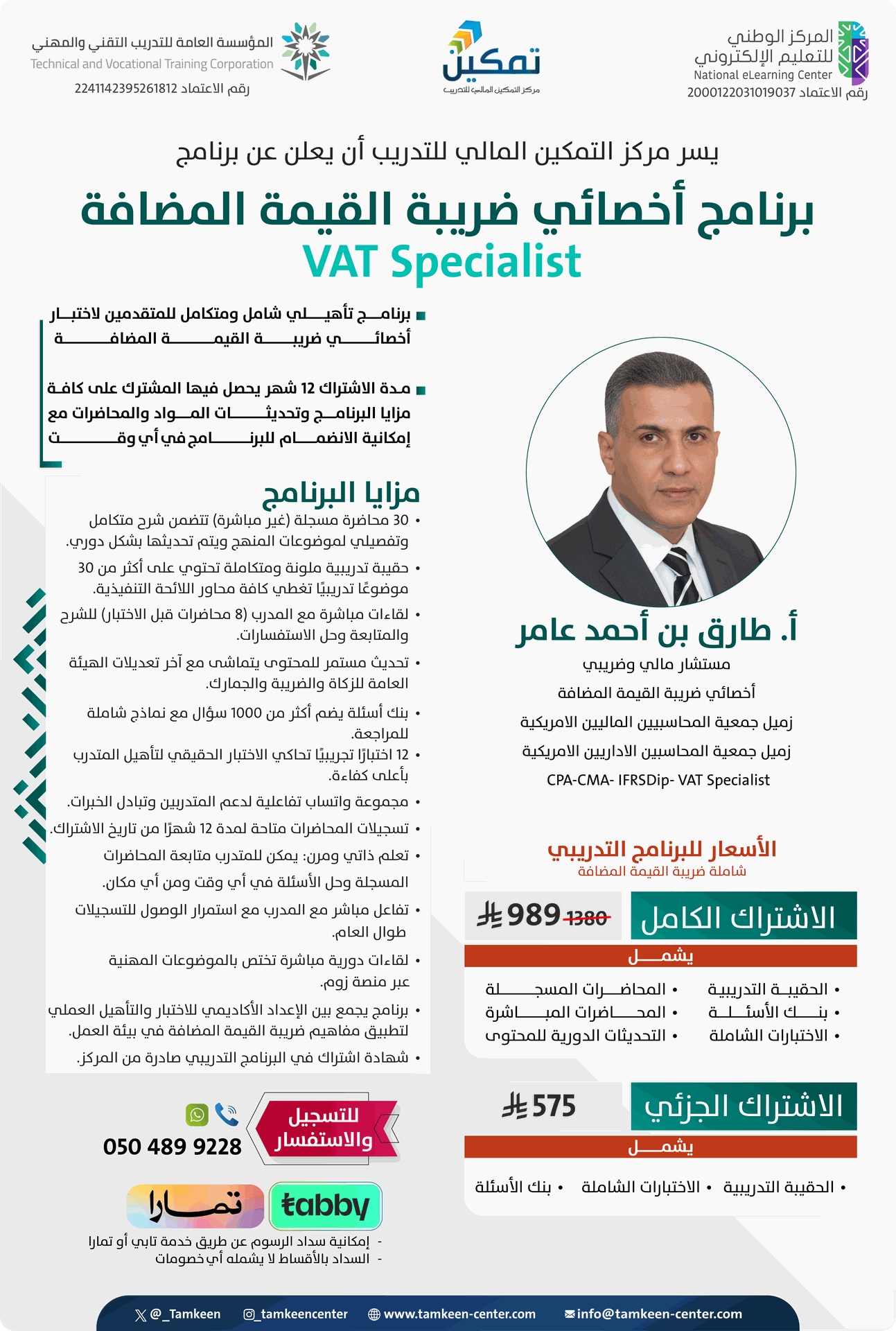 رجاءً تسجيل الدخول لمشاركة هذا البرنامج التأهيلي الشامل-أخصائي ضريبة القيمة المضافة(المواد التعليمية فقط) عن طريق البريد الإلكتروني.